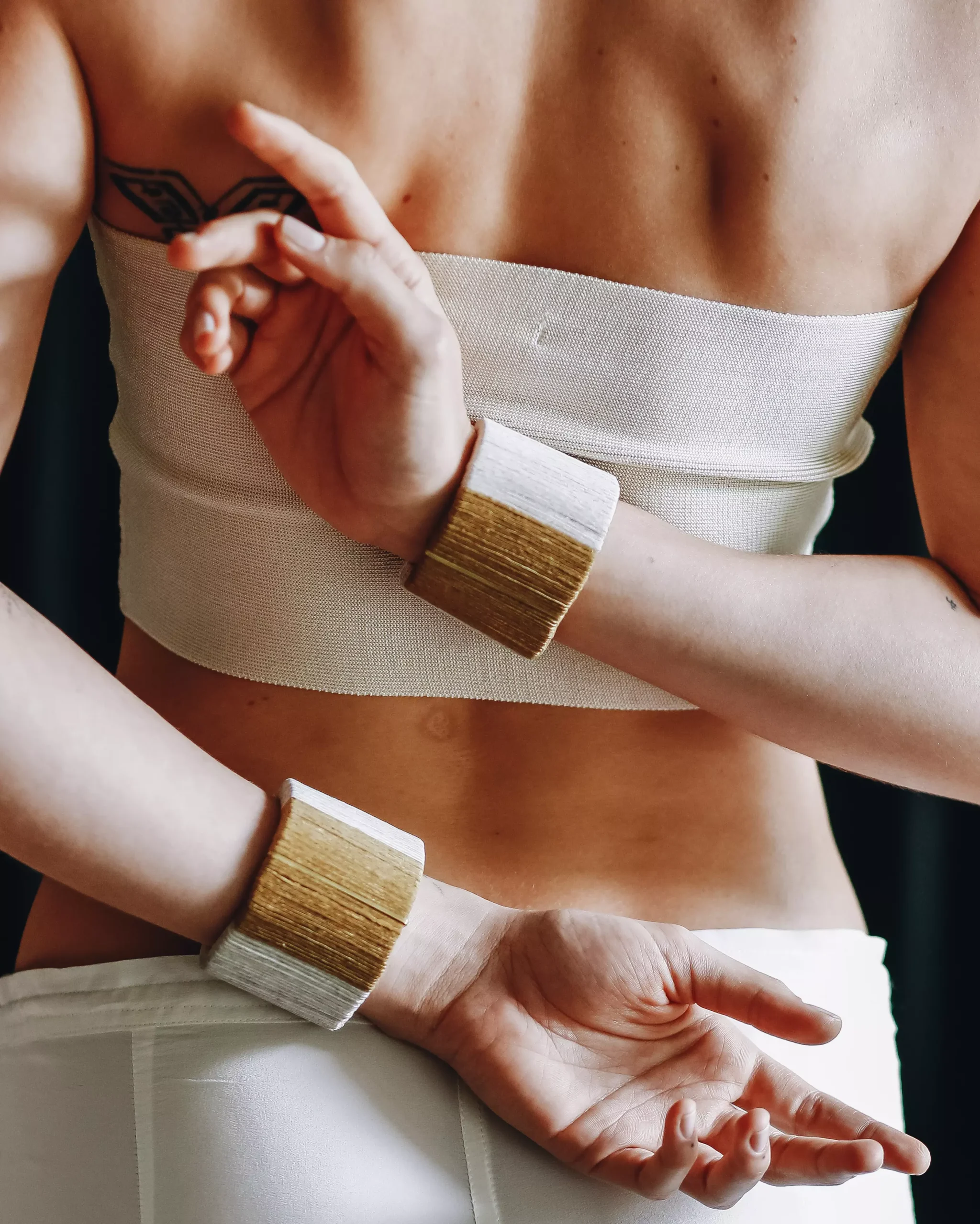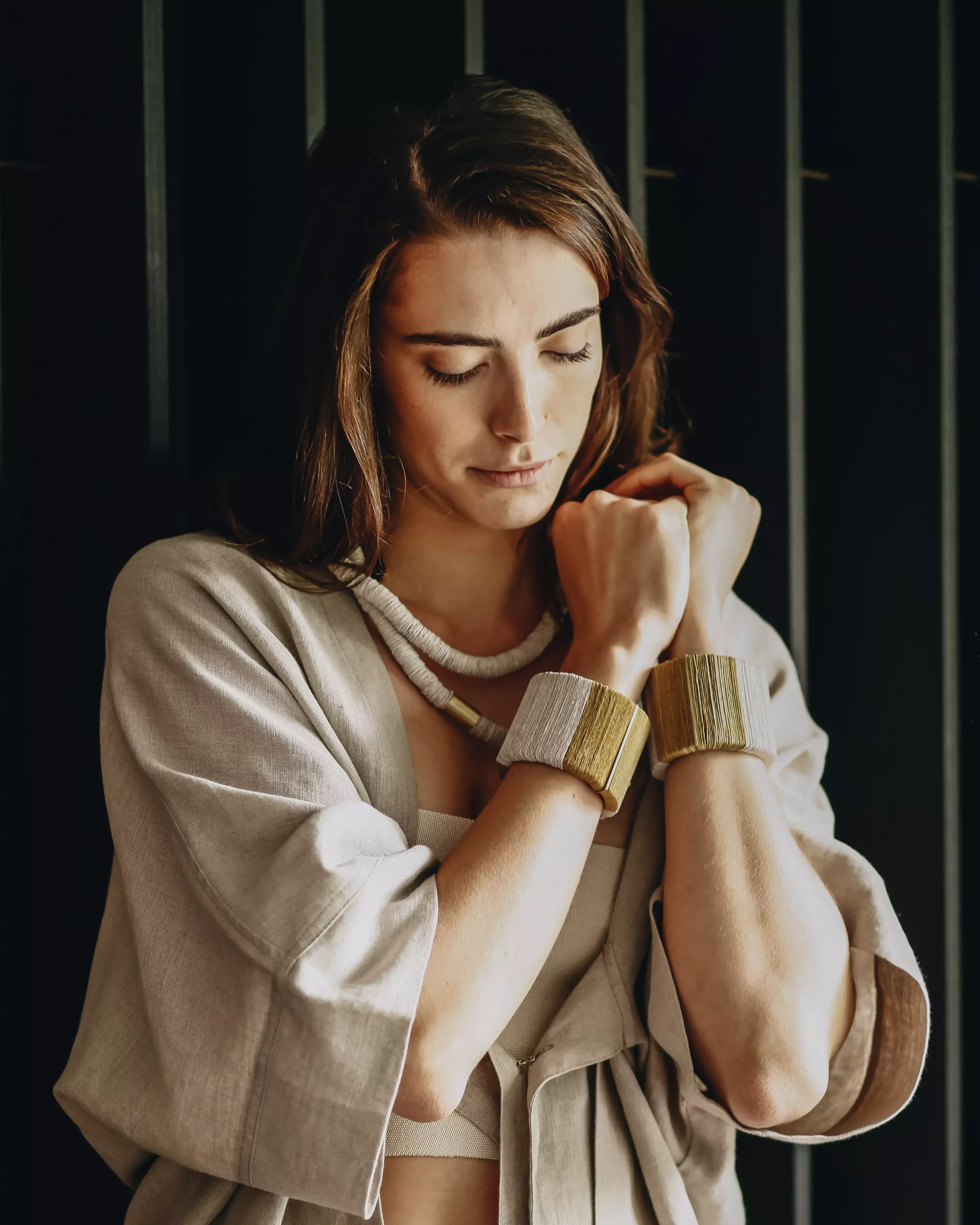 Adicione um toque de dualidade ao seu estilo, feito à mão com duas cores vibrantes de papel reciclado artesanal e complementado com duas placas de latão, esta peça da Linha Encontros é um testemunho da criatividade e da inovação. Em colaboração com a joalheira Taís Francelli, cada bracelete é uma declaração de arte, onde o movimento e a rigidez coexistem em perfeita harmonia. Ideal para quem busca exclusividade e sustentabilidade com um toque de ousadia.